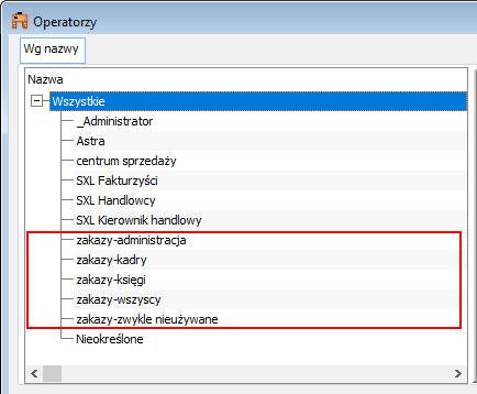 - wszyscy - wzorzec, który może posłużyć do wskazania zakazów na wszystkich operatorach w firmie. Domyślnie zdefniowano na nim tylko zakazy związane z eksportem danych do Excela i pliku tekstowego.